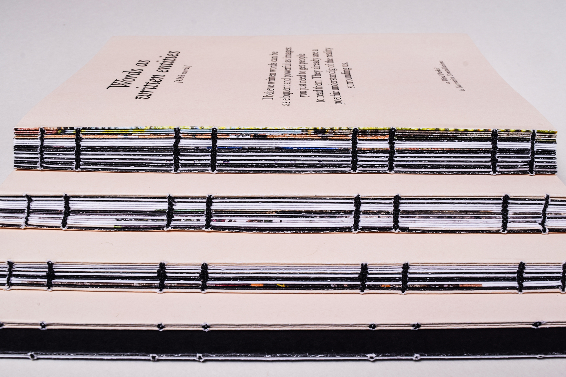 For the last years, I have been working on participatory art projects, printed books, editorial design, visual communication as well as in creative writing projects, which allowed me to intuitively develop a fundamental axis of work that runs throughout all my artistic creations: words. Whether written, oral or used as an image, they are presented in my work as the objects of study themselves, as narratives, or as the indispensable resource through which the projects are developed.